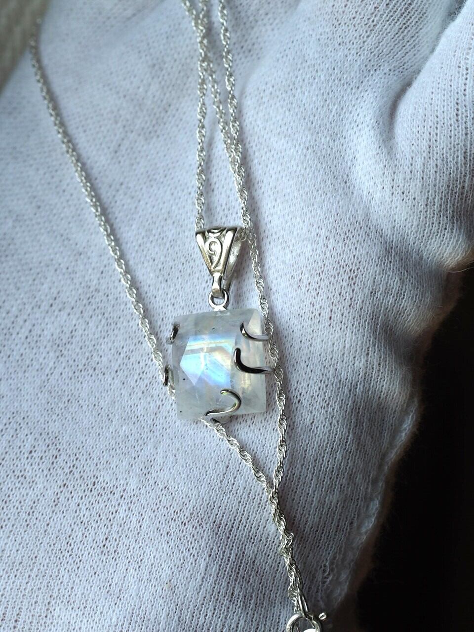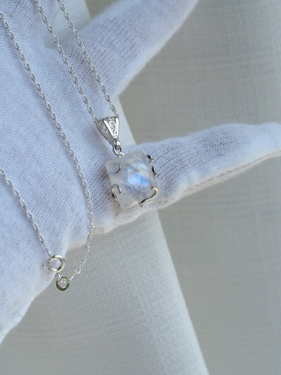 ハイグレードレインボームーンストーン14 レクタングルS925wgくるりん台座ネックレス❀
