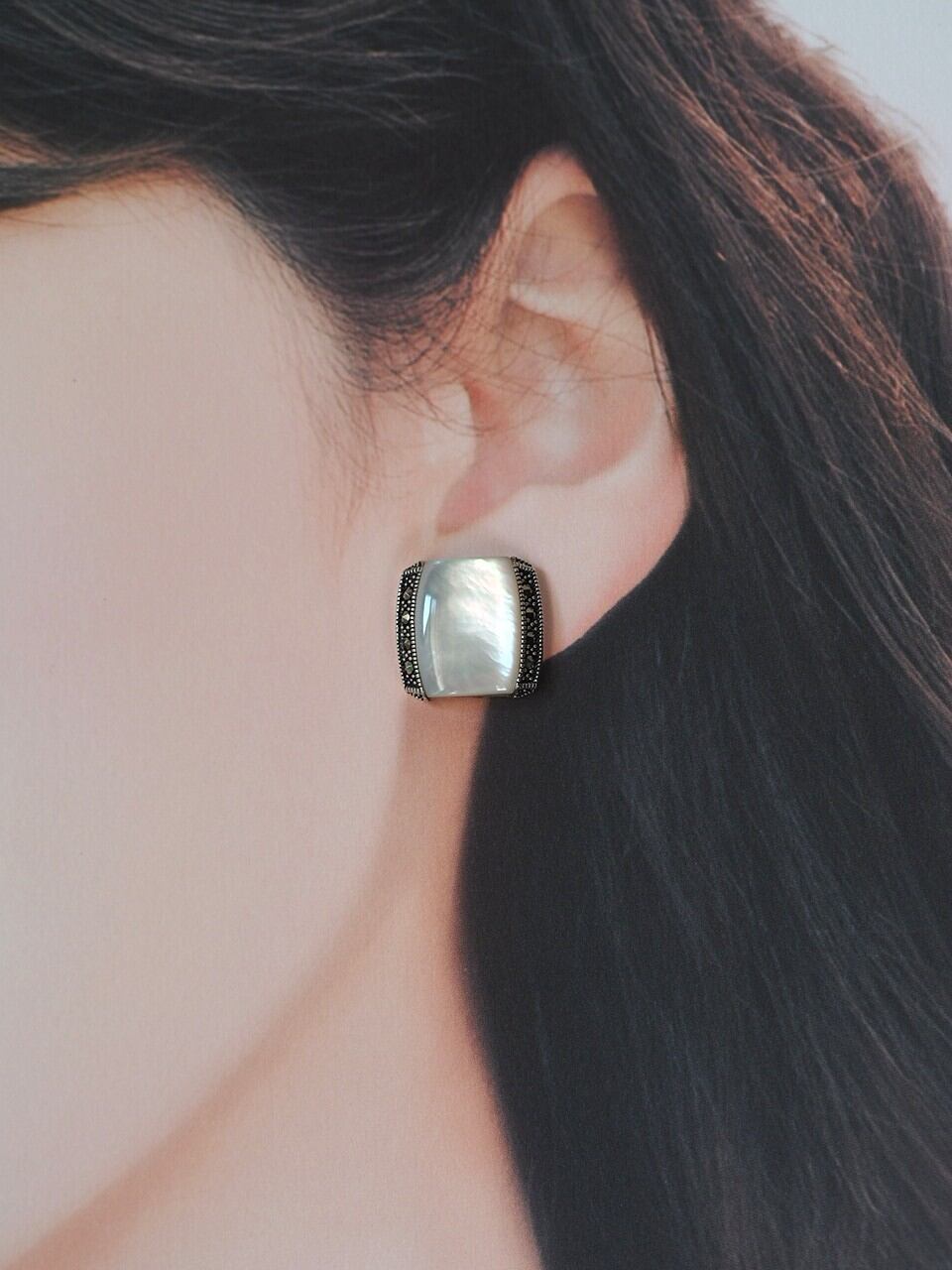 マザーオブパール&マーカサイト15x11 S925スターリングシルバーレクタングルピアス♬